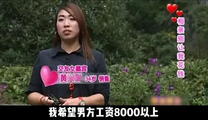 黄女士34岁,房产销售,月薪3000元,她想找一个月薪8000元以上、有房子、愿意为她花钱的男人。