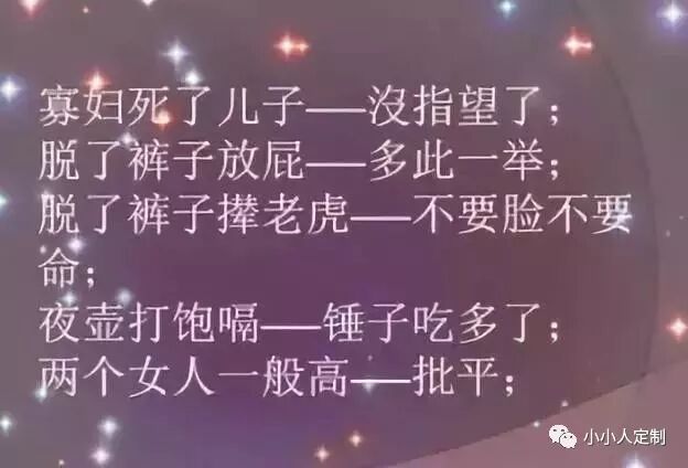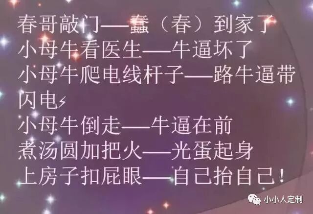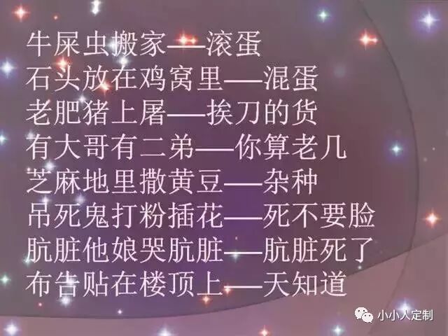 31.种地不出苗--坏种 32.看衣服行事--狗眼看人 33.铁匠铺的料--挨打的货 34.强盗画影像--就你那副贼形 35.墙头上跑马--不回头的畜牲 36.瞎子拉琴--瞎扯 37.上打口红--装纯(唇) 38.春哥敲门--蠢(春)到家了 39牛屎虫搬家---滚蛋 40.天落馒头---狗造化
