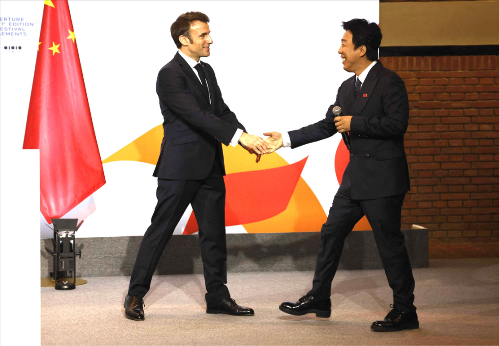 当天晚上,马克龙现身北京一家美术馆,参加第17届“中法文化之春”艺术节开幕式。活动上,担任揭幕嘉宾的马克龙与本届艺术节的宣传大使演员黄渤同台亮相,引发热议。