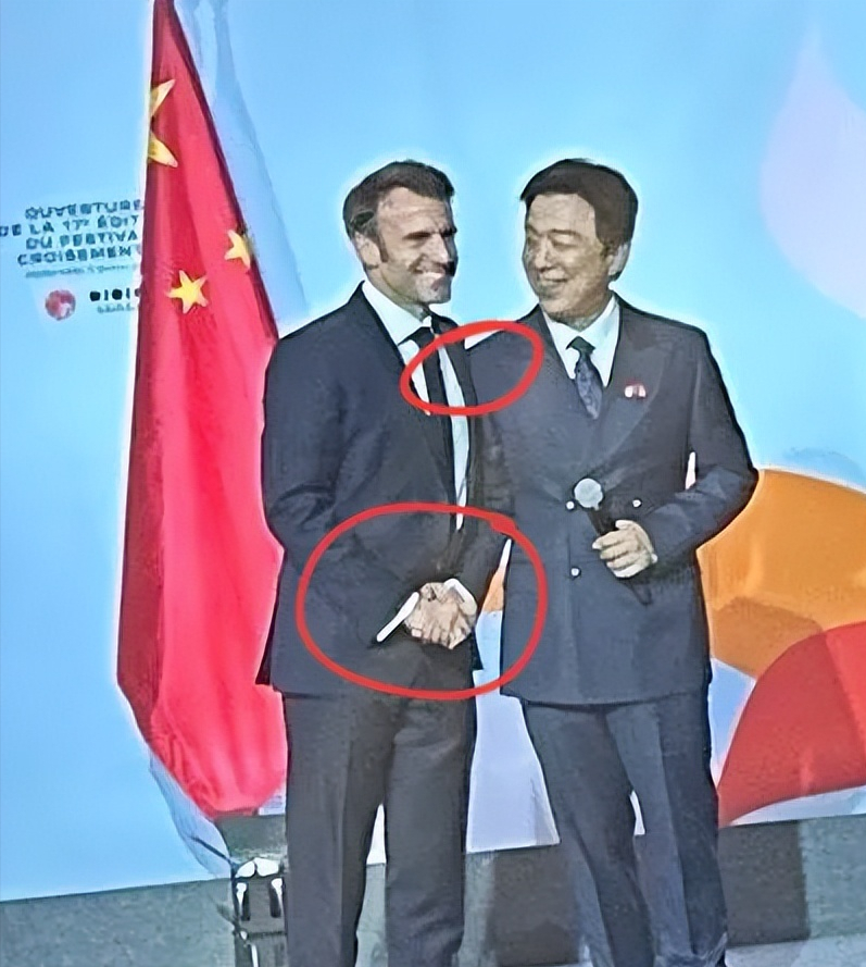 只见他在跟马克龙合影时身体明显往马克龙身上倾斜,甚至于已经“栽到马克龙身上”了,此举无疑是在照顾对方的身高问题。