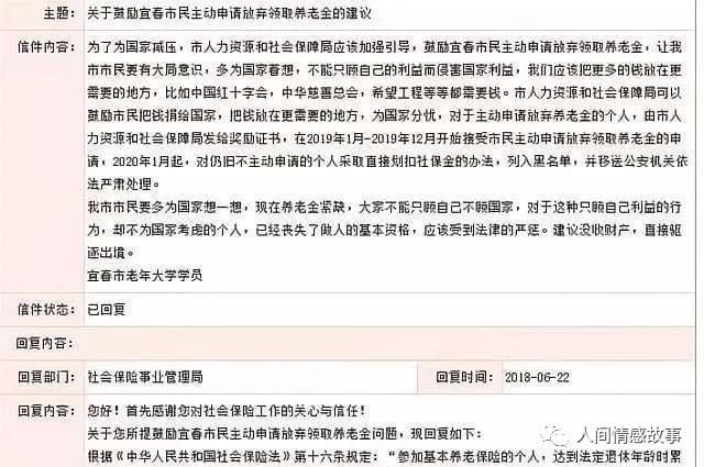 阅读本文前,请您先点击上面的蓝色字体“人间情感故事”,再点击“关注”,这样您就可以继续免费收到文章了。每天都有分享,完全是免费订阅,请放心关注 今天,一位网友翻出了一则老新闻,我看了后,实在是不吐不快。事情是这样的,江西有一个宜春市,也就是过去我们说的一座叫春的城市,这城市里头有一位老年大学的学员,应该也是一位退休的老同志了,他提出来一个令人咂舌的观点:现在国家养老金缺口很大,他建议老年人应该主动放弃领养老金。