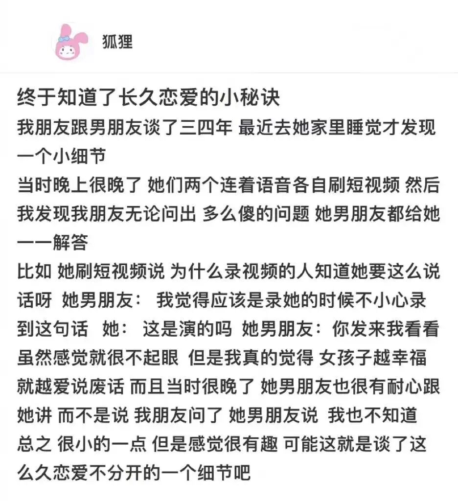 博主@狐狸分享了自己朋友和男朋友的恋爱小细节,她在去朋友家住的几天晚上,发现不管朋友问出多傻的问题,男朋友都不厌其烦地给她一一解答。没有嫌她说的是废话,更没有用“我不知道”敷衍她。