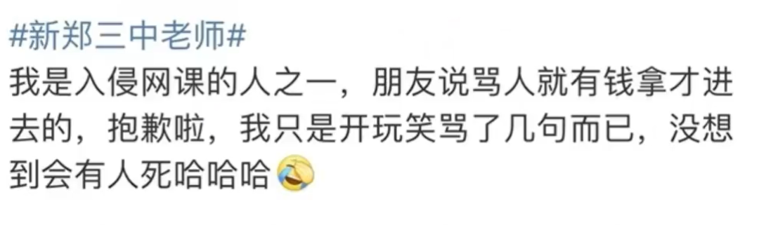 11月3日,一位网友发帖称自己就是入侵刘某课堂的其中之一。 因为朋友说进去骂人就有钱拿才去的,没想到会有人死亡。 帖子后面还发了几个“哈哈哈”,丝毫感受不到他的愧疚之心。
