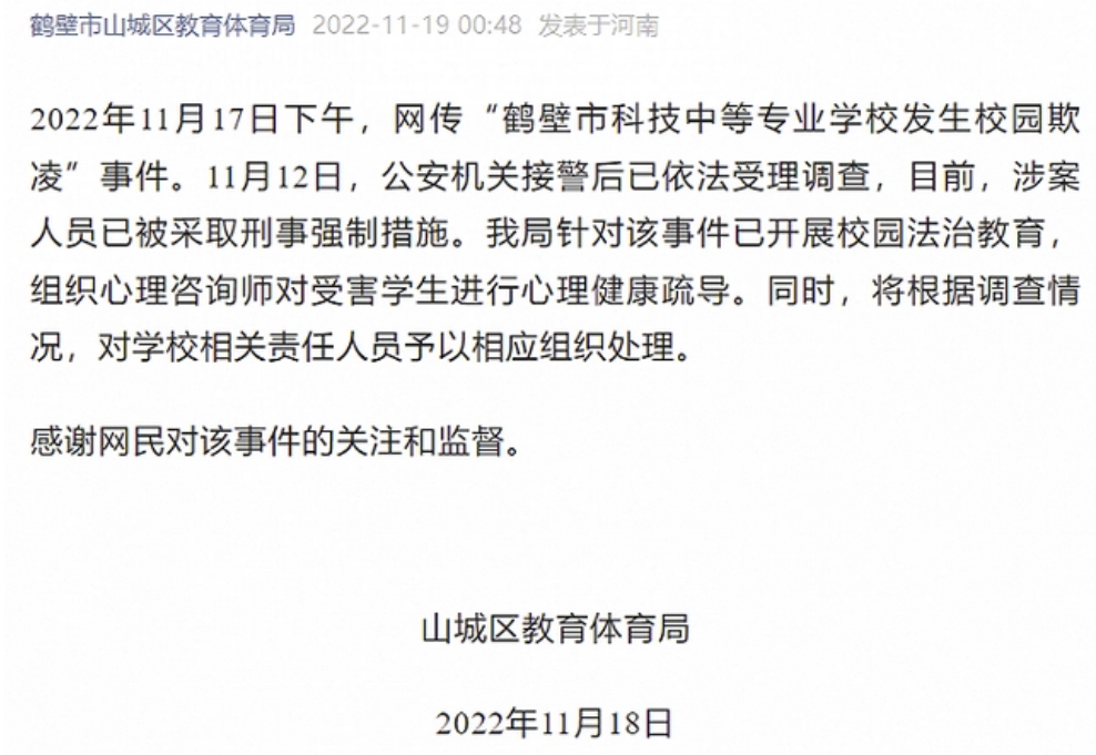 万分无奈的小李父亲只好在网络上寻求帮助。 不断在网上发帖,只为讨要一个说法。 若没有这位父亲坚持不懈的控诉,这件事也许就会不了了之… 好在小李父亲的控诉受到了相关人员的关注,众网友也不断帮助其扩大舆论。 终于,许是在网络舆论的压力之下,当地教育体育局发布了一则相关通报: 称涉案人员已被采取刑事强制措施,并已组织相关人员对受害者小李进行心理疏导。