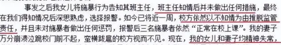 到底该如何面对? 校园霸凌的危害浪妈在这里不必多说,大家应该都清楚。 小李和她的母亲均精神失常,一个完整的家庭无法正常生活。 她们甚至有了跳楼的想法,这又何尝不是一种悲哀? 但凡学校处理得及时一点,施暴者能够早日道歉,兴许都不会变成这样… 小李的父亲坚持不懈得到了回应,可无数所校园中又还有多少人因校园霸凌无法安睡呢? 最后,浪妈只希望施暴者能够真正受到惩罚。 莫要再让受害者一家寒了心! 网友热评 网友1: 这件学校霸凌事件,学校是不是负主要责任,学校的管理,班主任的不作为,校长的不重视,统统处理! 网友2: 她们居然还有两个是学学前教育,如果这件事一直被隐瞒,这两个施暴者毕业进入教育行业,这多可怕! 网友3: 校园霸凌一定要严惩,总是以道歉和解结束,校园霸凌会越来越严重,会有越来越多的孩子受到伤害。17岁的孩子怎么可以这么坏呢?父母是怎么教育的?一定要一起严惩!这心是有多狠才能做出这么残忍的事情? 评论区聊聊你的观点吧~ 如果喜这篇文章,点个【赞】和【在看】吧一起为给孩子更好的教育发声。