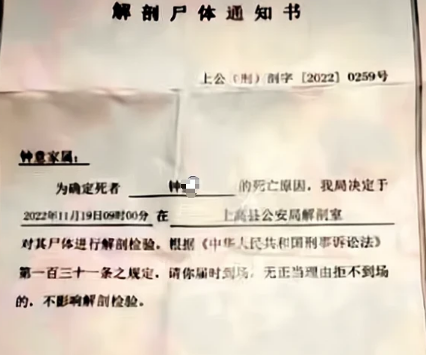 被“割喉”致死? 近日,江西省宜春市一名初中女孩遇害的信息在网上引起关注。 关于这件事情的信息最早源于一则视频。 视频发布于11月19日晚上,内容也让人十分震惊。 里面有一张女孩的照片和学生证,从学生证中我们可以看出女孩是当地某中学初三年级的学生。 除此之外,视频里还有一份《解剖尸体通知书》, 通知书上明晃晃地写着女孩的名字——钟某。