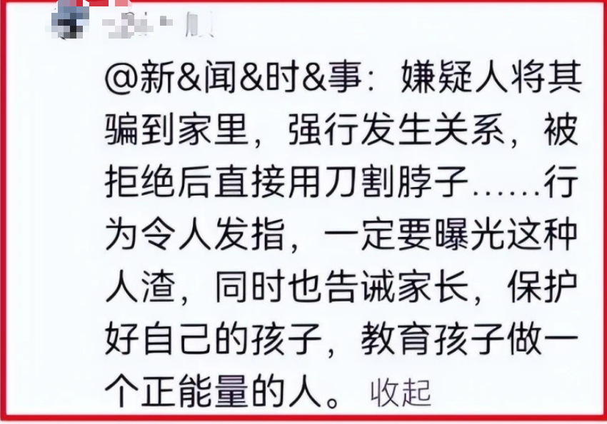一位自称是钟某姑姑的人在网上进行了爆料: 她说自己的侄女是被同级的男同学骗到家中被“割喉”杀害的。 男生与钟某同住一个小区。 而钟某之所以会同意前往这名男生的家中,是因为男生告诉钟某前往家里拿什么东西。 两人是同学,又同住一个小区,钟某自然也没有过多的防备。 但没想到,男生并非真心实意邀请钟某去家中拿东西!