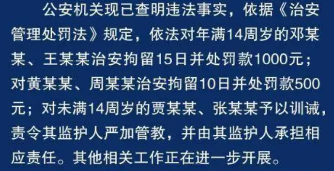 好在受害女生徐某经送医检查后已无大碍。 事情被曝后,有不少热心群众自发聚集在学校门口,要求学校严惩施暴者。 当地警方很快就展开了调查,将涉事人员抓获。 从警方的后续通报来看,施暴者都受到了相应惩罚。