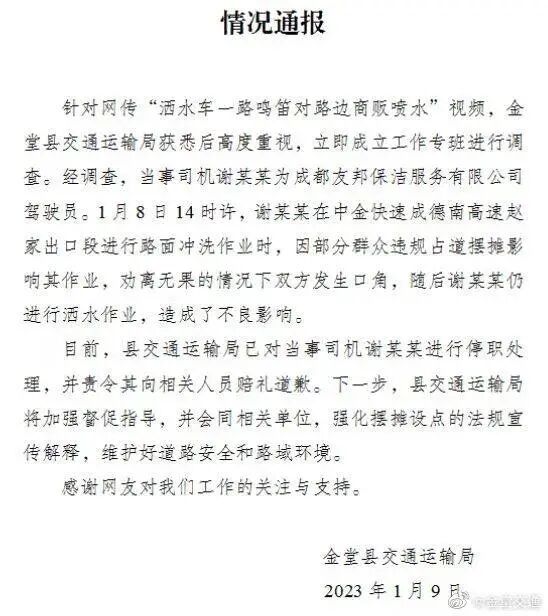 成都金堂县交通运输局官方微博@金堂交通 1月9日通报,针对网传“洒水车一路鸣笛对路边商贩喷水”视频,金堂县交通运输局获悉后高度重视,立即成立工作专班进行调查。经调查,当事司机谢某某为成都友邦保洁服务有限公司驾驶员。1月8日14时许,谢某某在中金快速成德南高速赵家出口段进行路面冲洗作业时,因部分群众违规占道摆摊影响其作业,劝离无果的情况下双方发生口角,随后谢某某仍进行洒水作业,造成了不良影响。 目前,县交通运输局已对当事司机谢某某进行停职处理,并责令其向相关人员赔礼道歉。下一步,县交通运输局将加强督促指导,并会同相关单位,强化摆摊设点的法规宣传解释,维护好道路安全和路域环境。
