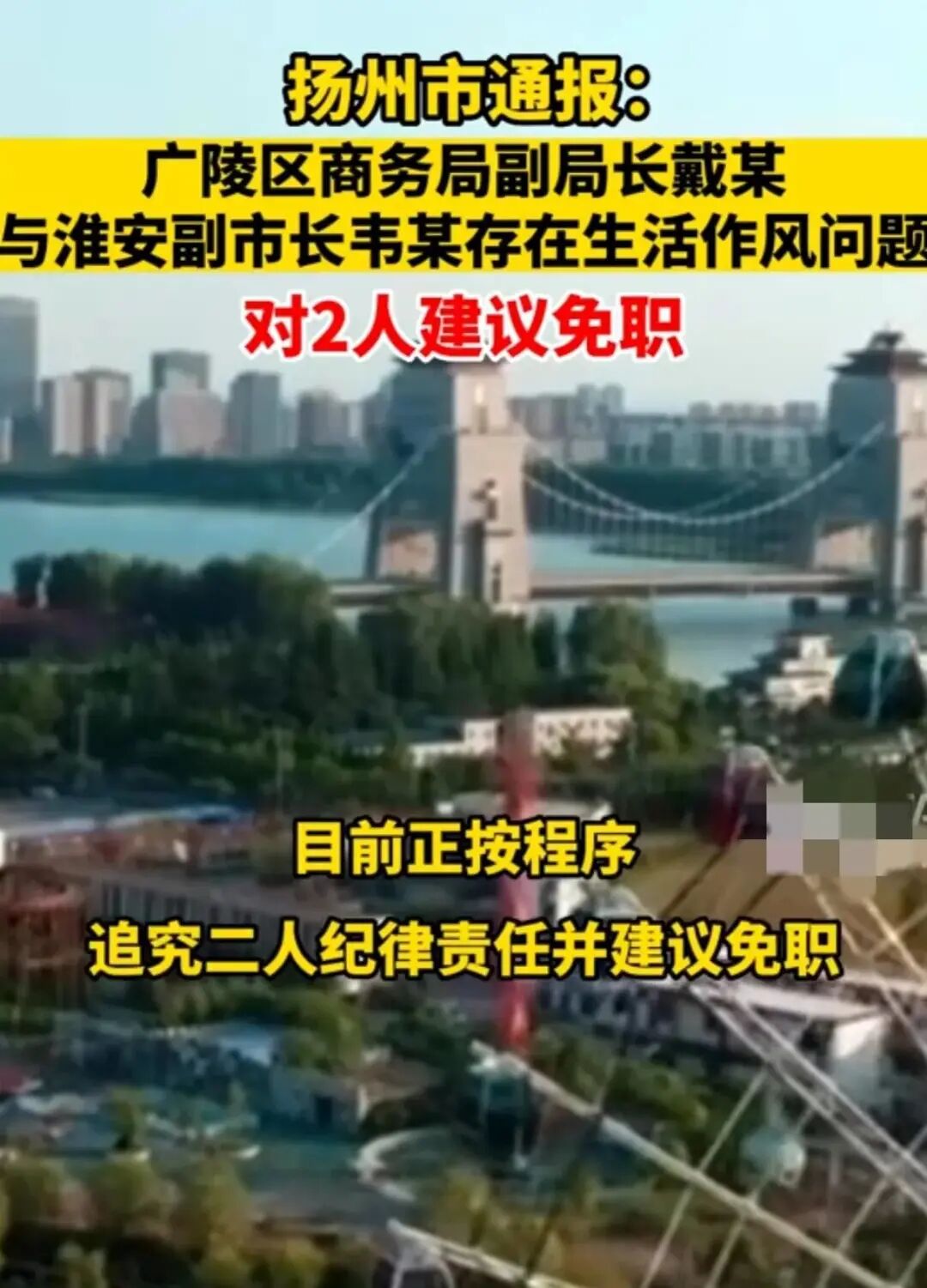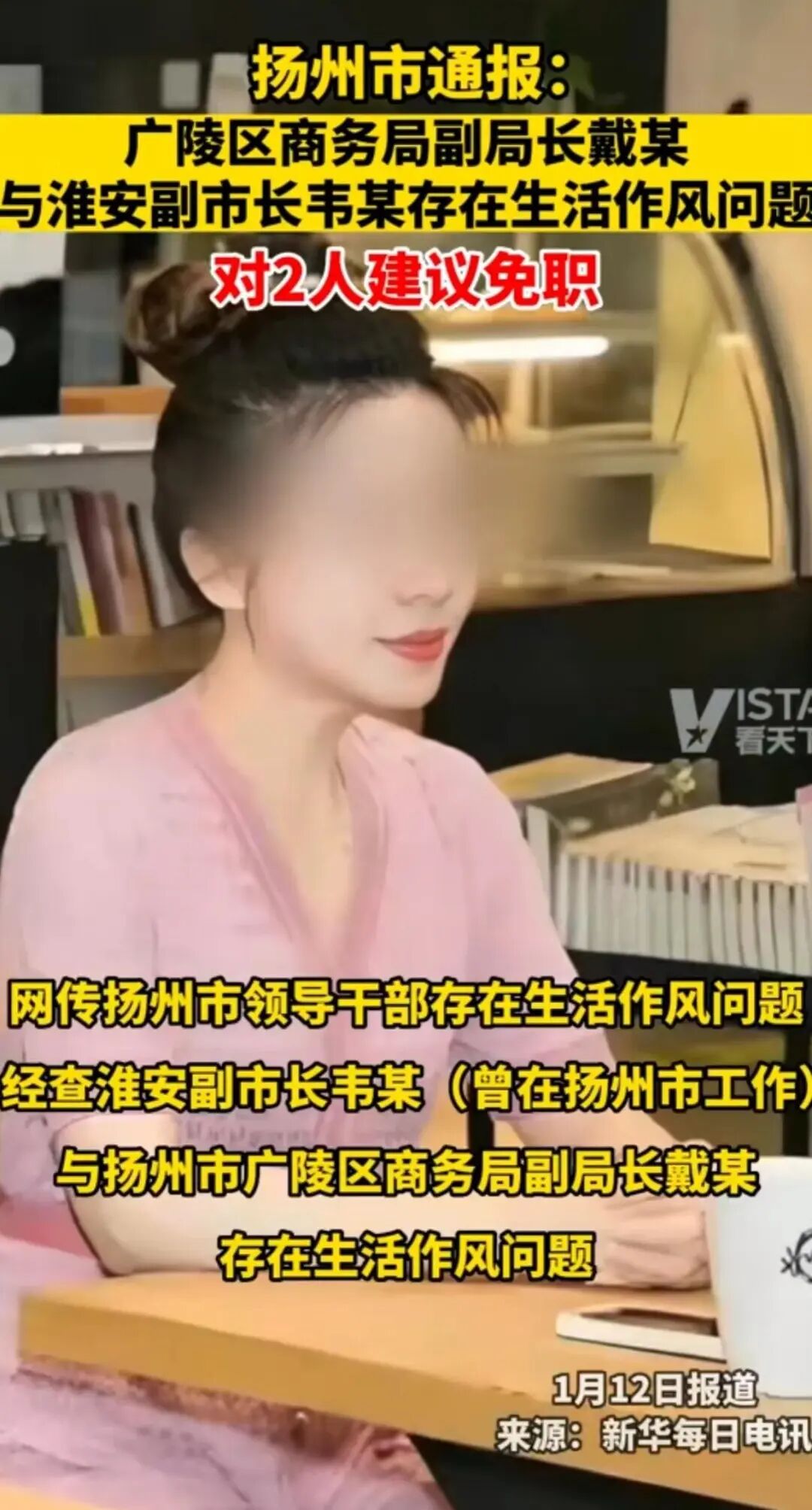 1月12日 扬州市关于戴璐事件发了最新通告 证实戴副局长与某副市长存在生活作风问题 不过这个副市长也从张市长变成了韦副市长 目前对两人的建议是免职!