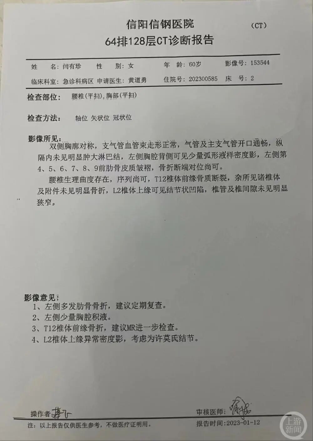 ▲董某持铁棍殴打王女士母亲。 王红丽表示,她在事发当时已报警,自己和母亲随后都住进了信阳信钢医院接受治疗,在王红丽展示的伤势照片中,显示自己脸部、嘴唇、脖子等多处被抓破,自己还有些头晕,在医院输液。 王红丽母亲闫有珍的伤势较为严重。上游新闻记者看到了医院急诊科出具的CT诊断报告,影像意见为:左侧多发肋骨骨折,左侧少量胸腔积液,腰椎T12椎体前缘骨折。