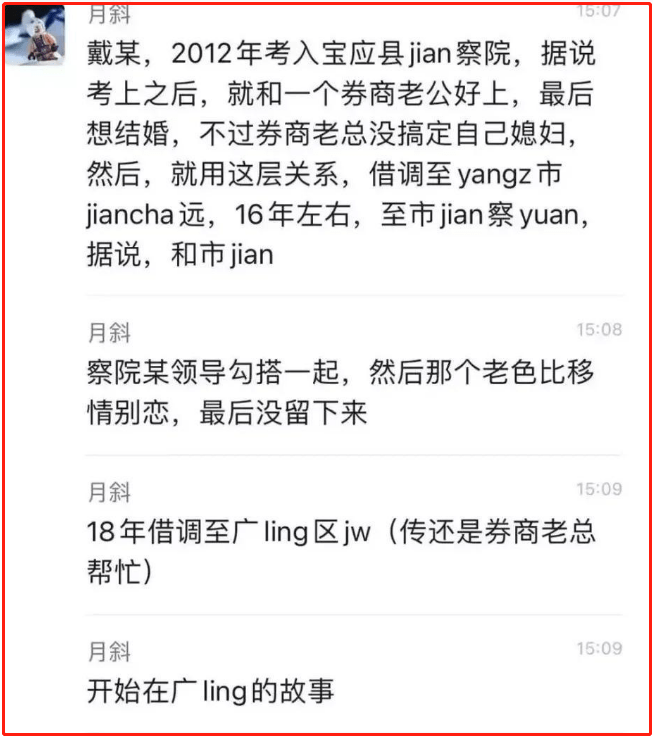 戴璐刚考入检察院时,因为没有背景和人脉,一度非常苦恼,随后利用自己姣好的容貌和身材傍上了一位富豪券商。 原本,这位券商想离婚娶戴璐,但是券商的原配太厉害了,死活就是不离婚,戴璐只能默默的成了第三者。 因为这件事,券商觉得对不起戴璐,随后开始砸钱砸人脉,一路帮着戴璐升迁,最后顺利去了扬州市广陵区。