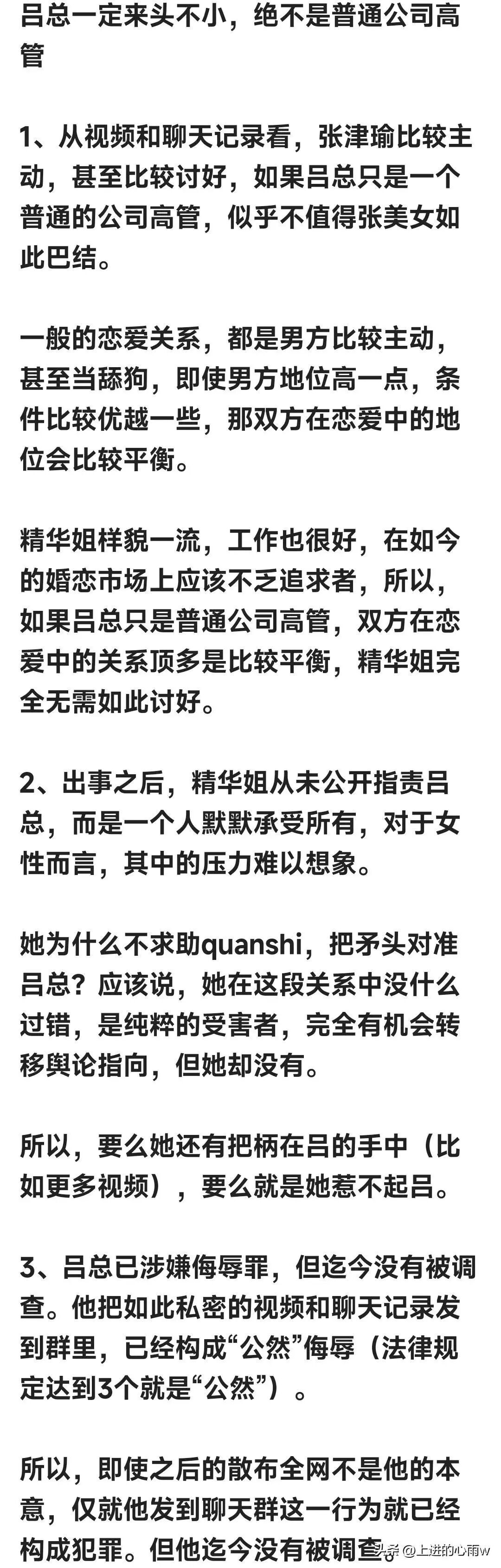 事业有成的吕总身边,早都是莺莺燕燕,他不可能为了瑜姑娘一片绿叶放弃整座森林。 过分的卑微只会让吕总的变态更加为所欲为! 也许瑜姑娘那点小心思,从狩猎的开始就被吕总看得明明白白,只是于姑娘太不自知,导致玩火自焚! 本来事情的发展不必如此难堪,顶多就是一位单身女青年爱上了一位已婚男士的狗血闹剧! 奈何我们的吕总做人太不地道,提起裤子不认人,不光白玩了,人家还要把视频发到网上,供人观赏,实乃不讲武德! 吕总是个什么样的人?