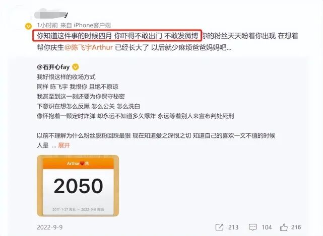 他本人被曝出了私照,虽说可能是正常恋爱关系,但是随后女方被扒出是他的站姐,而且女方疑似已婚,所以这件事情的性质直接变了。 陈飞宇也被质疑私联女粉作风有问题,很快引爆了热搜,本人更是面对大批粉丝脱饭,直接掉粉近10万。 甚至有老粉脱饭回踩,直言不奇怪,因为早知情早跑了。