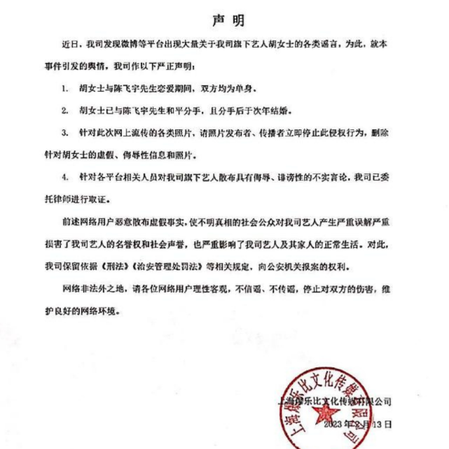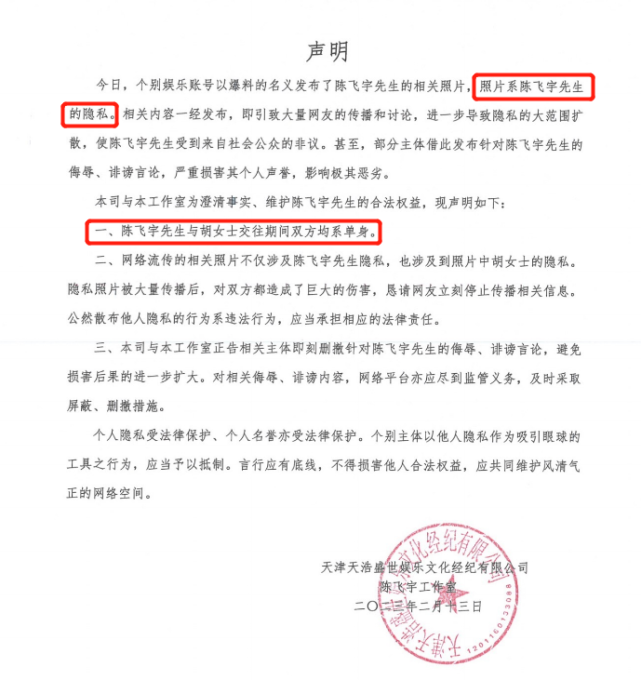 工作室声明直接承认了照片就是陈飞宇本人,但属于是个人隐私,照片曝光后引发了社会大众对陈飞宇的非议,造成了名誉损害,还引发了谣言,所以做出了几点声明。 一、陈飞宇与胡女士交往期间双方均系单身。 二、照片不仅涉及陈飞宇隐私,也涉及到照片中胡女士的隐私。恳请网友立刻停止传播相关信息。 三、公司和工作室正告相关主体即刻删除针对陈飞宇先生的相关争议言论。 最后声明中称,个人隐私受法律保护、个人名誉亦受法律保护。个别主体以他人隐私作为吸引眼球的工具之行为,应当予以抵制。