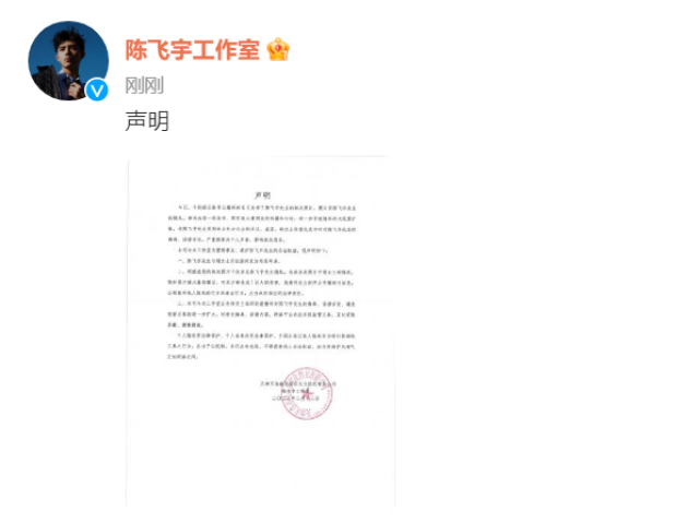 在等待了半天时间后,陈飞宇工作室的声明姗姗来迟。