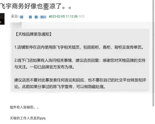 先是有某酸奶品牌将陈飞宇的微博转权限,接着还有品牌发出通知,撤掉陈飞宇的相关物料,并安排了客服回复话术,做好了艺人翻车后续的准备。