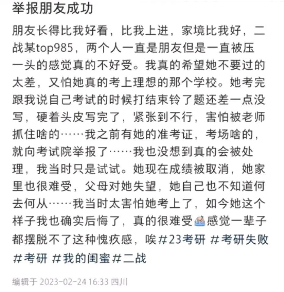 近日,有网友匿名向树洞倾述,自己偷偷举报了闺蜜考研违规,导致闺蜜成绩被取消,引发网友热议。