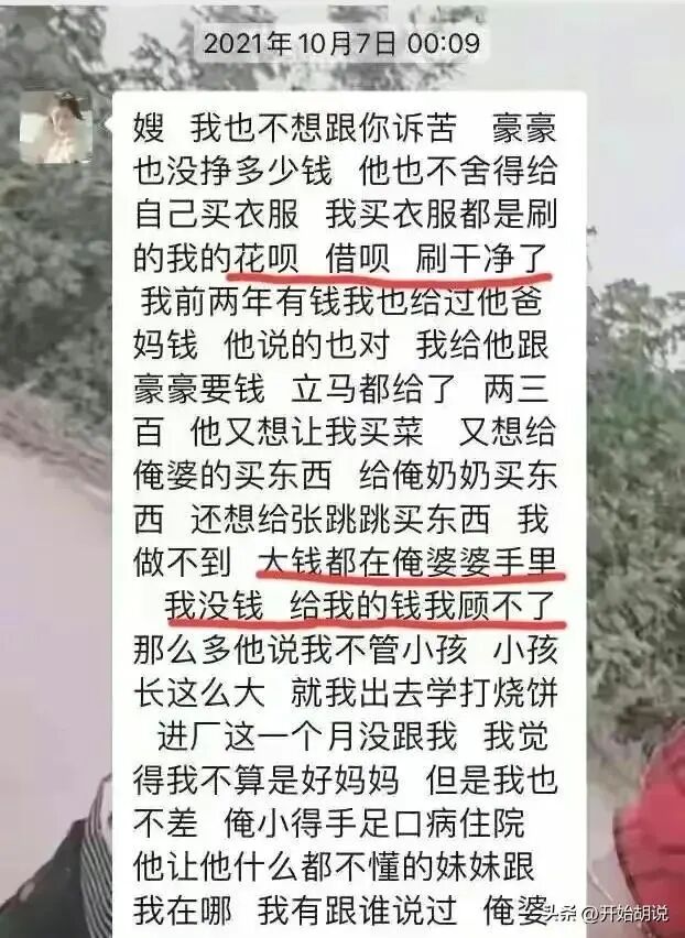 据被害女子嫂子爆料“被害女子生前与其诉苦说,家里孩子小,由于在家要照顾孩子,没办法出去工作。而丈夫赚的工资又不交给她,所以她只能用花呗,借呗借钱花。而婆婆还经常有事没事的找她吵架,让她感觉到婚姻不幸福,想要离婚。而女子刚刚想要自己出去摆摊创业,补贴家用”。