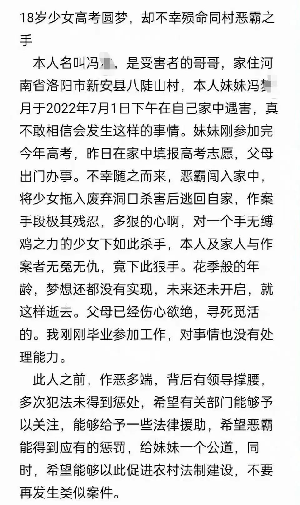 遇害前,她已填报好高考志愿,是河南省最好的大学——郑州大学。