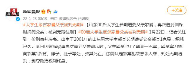 山东男生刺死父亲被判无期徒刑,曾长期目睹父亲家暴;