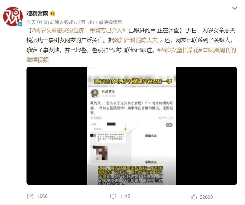 许超在7月22日下午发出一张截图,截图中一名粉丝私信称,其朋友的群里接诊到一个2岁小女孩,肛周“长菜花”,请教是否有性传播可能,并附上打码图片。