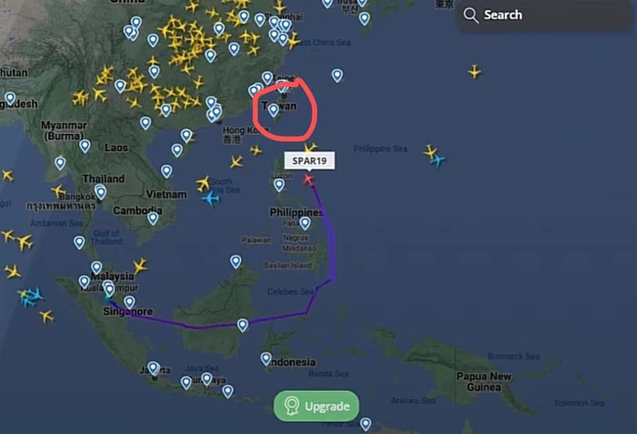 首先,佩洛西的专机在朝着台湾方向驶来时,是从外部绕行而来。