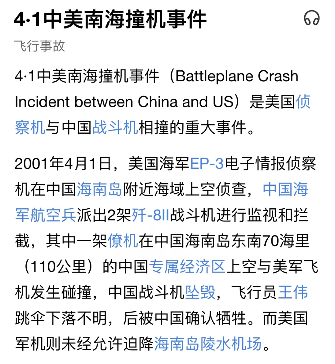 大家议论的2001年4月1号的南海撞击事件,跟此事完全不一个概念。