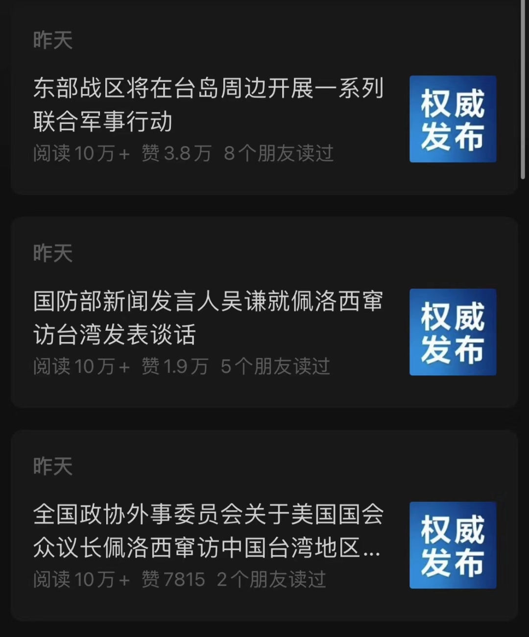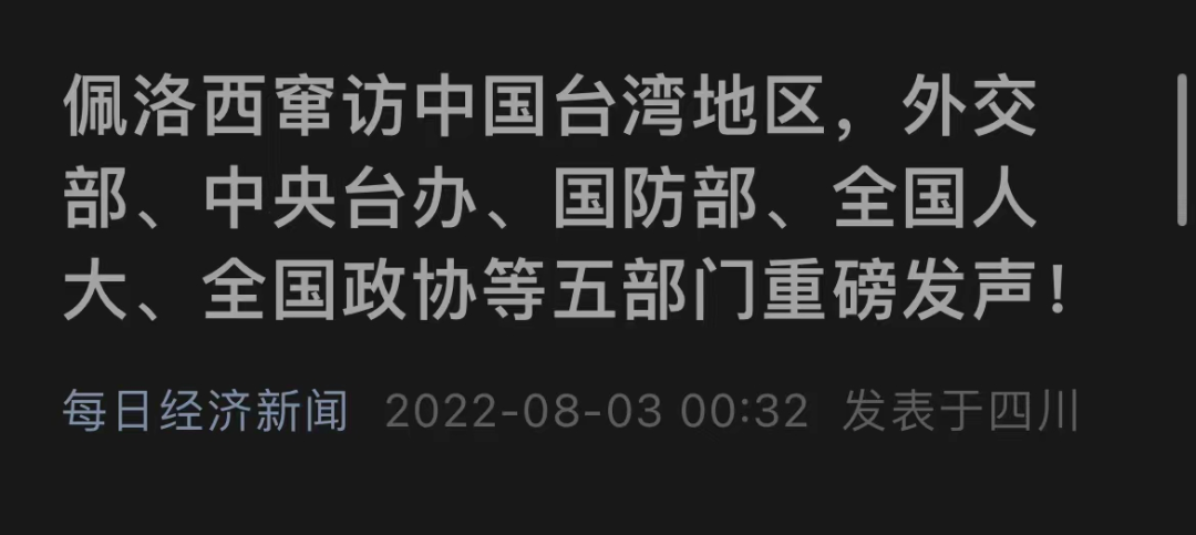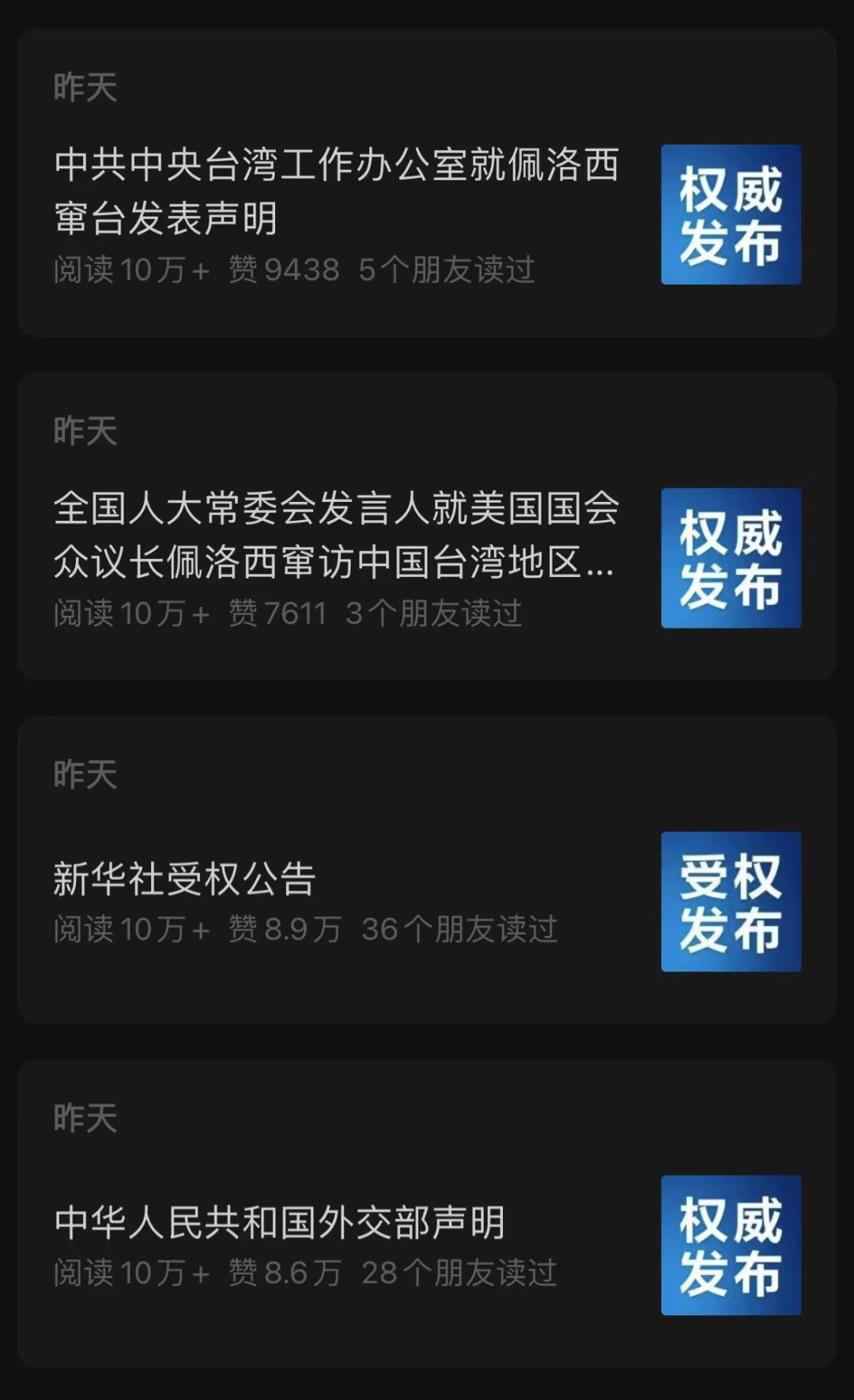 从佩洛西登台10分钟后,也就是10点56分,到11点38分,新华社连发7篇文章,一篇比一篇有分量,让人看了热血沸腾。