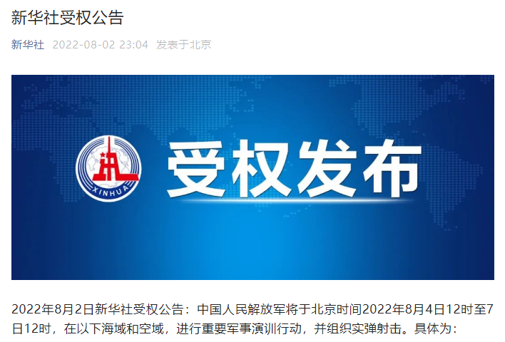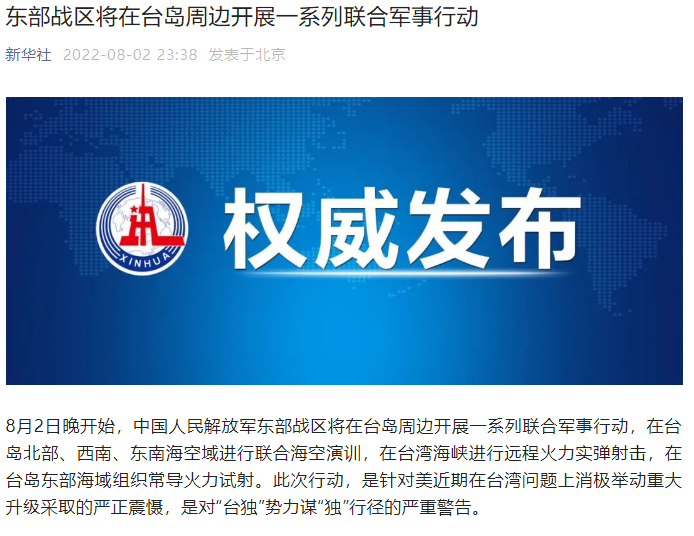 东部战区表示,从8月2号当晚开始,将在台湾岛周边开展一系列军事行动:在台岛的北部、西南、东南海域空域进行海空演训,在台湾海峡进行远程实弹射击,在台岛东部海域组织火力试射!