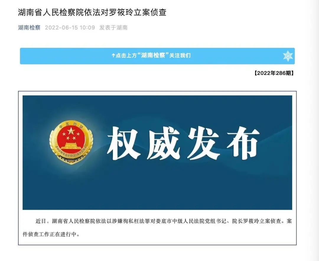 2022年6月15日,湖南省娄底市中院院长罗筱玲,因涉徇私枉法罪被立案侦查。