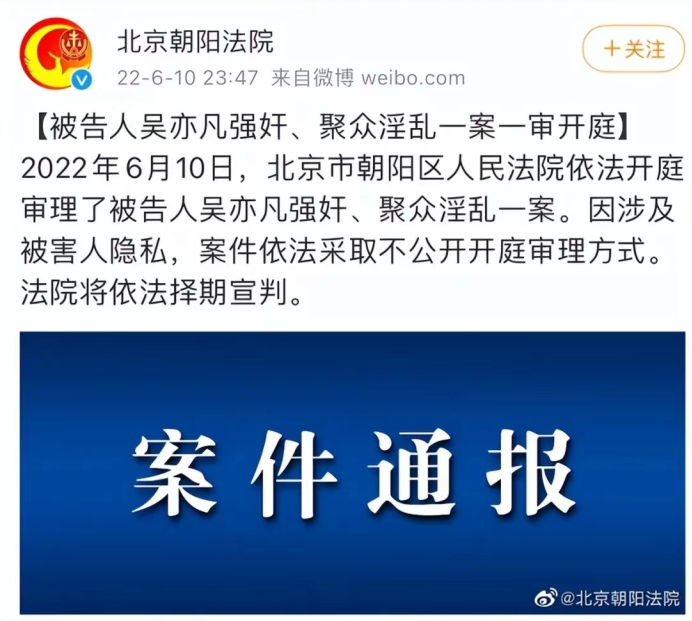 2022年6月10日,北京朝阳区人民法院开庭审理了吴亦凡一案。
