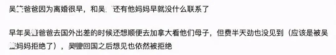 据网友爆料,早年吴亦凡爸爸有要过去加拿大看望自己儿子,但是被吴亦凡妈妈拒绝,耗费很多力气都没有见到。后来吴亦凡回国发展,爸爸想见一面,依旧被吴亦凡妈妈强势拒绝。