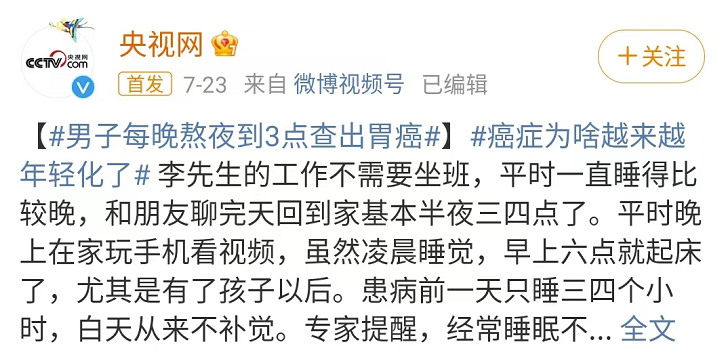 平均每天只睡3、4小时,长此以往感到身体不适,到医院一查,确诊胃癌。