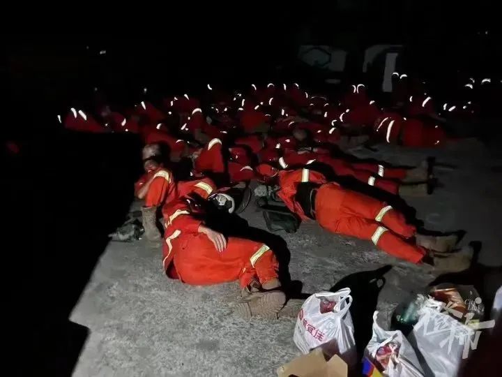 参与救火的消防员和工作人员,累得直接睡倒在地上。