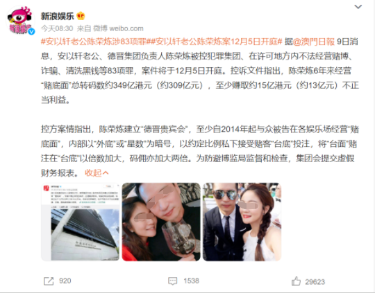 9月15号,@新浪娱乐 发文称:据澳門日報9日消息,安以轩老公、德晋集团负责人陈荣炼被控犯罪集团、在许可地方内不法经营赌博、诈骗、清洗黑钱等83项罪,案件将于12月5日开庭。