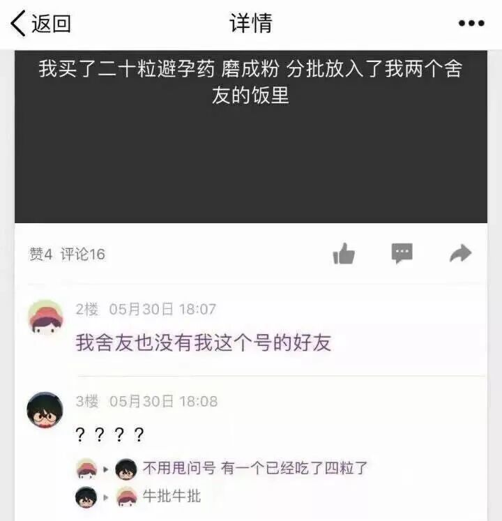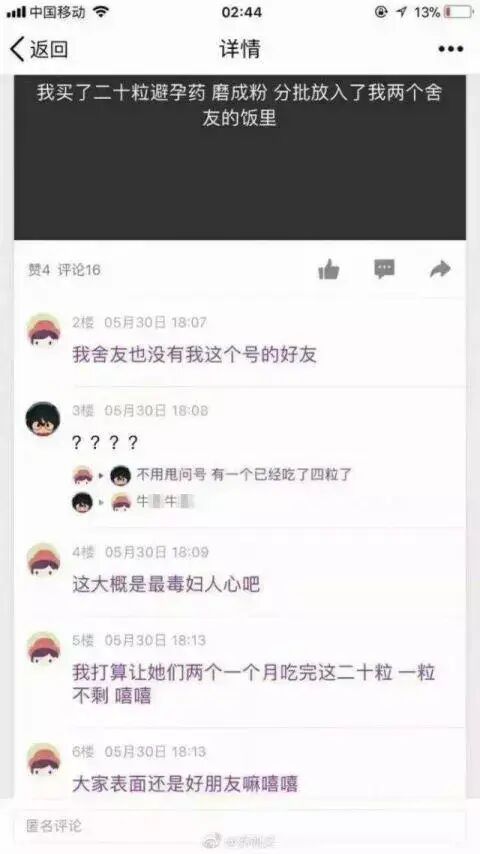 一个女孩说自己买了二十粒避孕药,磨成粉,分批放进了两个室友的饭里。