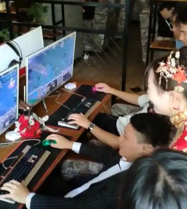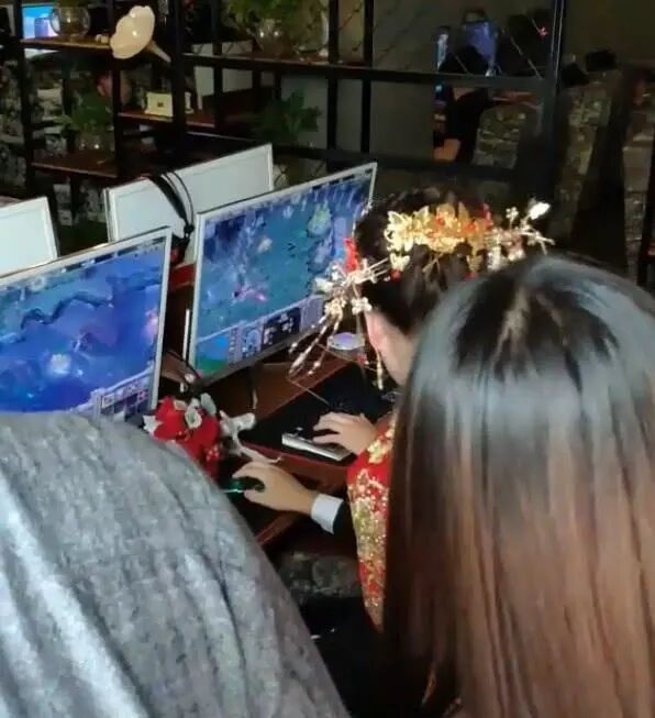 也可以说新娘不是去接新郎,而是去找新郎,难道是因为新娘太丑,新郎逃婚了?新娘还是很好看的啊,真是奇怪了,新娘带着伴娘团最后来到了一家网吧,看到新娘进入了网吧,这样大家还是很惊奇的,难不成新婚当日新郎还跑去网吧里打游戏吗?新郎的做法也是刷新了我的三观,他竟然真的在电脑前玩游戏,这可是自己结婚啊!