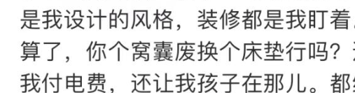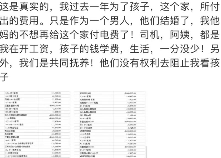 图片来源:微博截图,侵删 同时控诉,孩子是他们共同抚养的,自己一分钱都没少付,并不像网传的那般,所以他们是没有权利阻止自己去看望孩子们的。虽然汪的文字表达有些混乱,字里行间也都透露着激动情绪,但这并不妨碍网友们的解读。很快,这昔日的一对夫妻,便再次登上热搜。可还没等网友们从汪曝光的巨额的家庭花销中,缓过神儿来,他的第二波爆料便紧随其后。说现在前妻和现任丈夫所居住的那个房子是他购买的,现如今的房贷也是他在支付的,装修设计也都是他当时的风格。