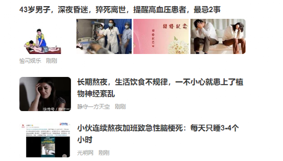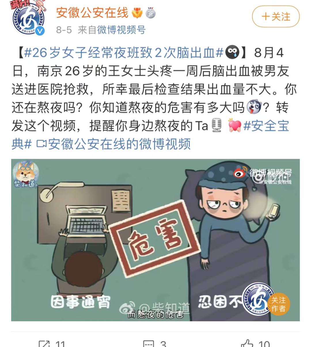 8月5日有新闻报道,26岁的王女士脑出血被送进医院抢救。而她第一次脑出血是在2年前,当时也是因工作原因昼夜颠倒每天只睡四五个小时,那次病后留下了后遗症,右边身体变得麻木,拿细小东西扎也没感觉。