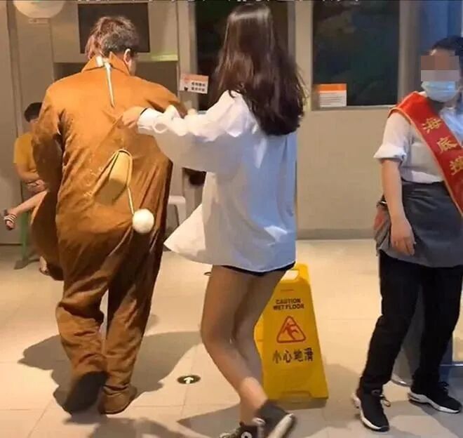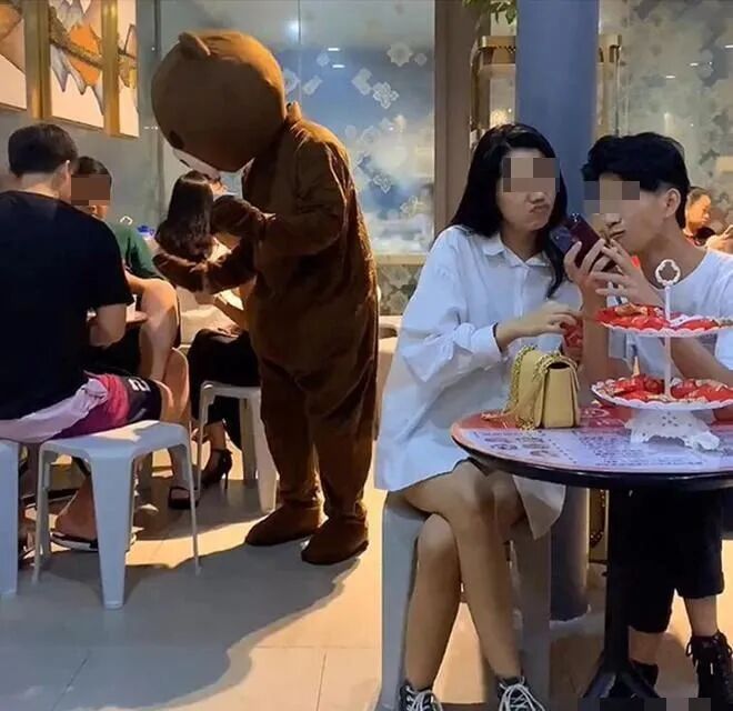 他慢慢地走到这两个人跟前,只见女子根本就没看出来眼前的这个大狗熊是谁,依然和旁边的男子腻腻歪歪。